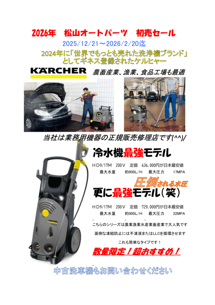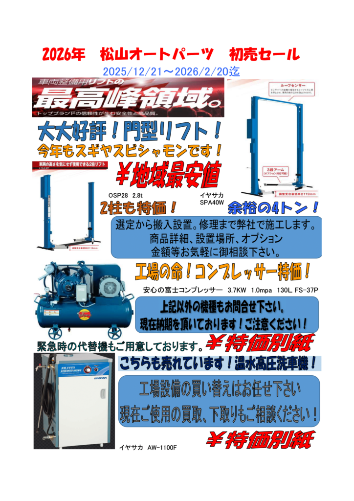 2026初売り 門型リフト、コンプレッサー、温水高圧洗車機