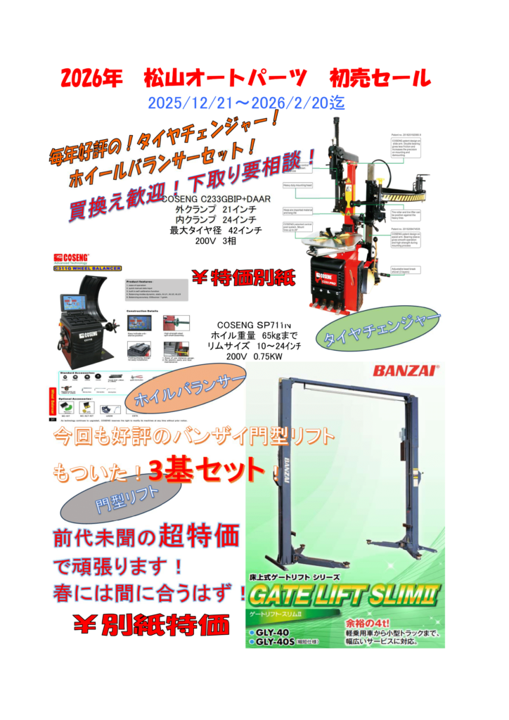 2026初売り タイヤチェンジャー・バランサーセット、更に門型リフトを加えた3点セットも