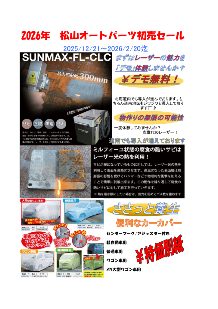 2026初売り ファイバーレーザー洗浄機デモ案内、養生カーカバー