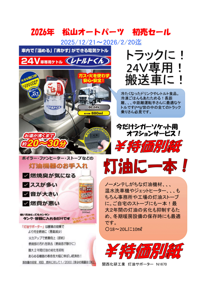 2026初売り 24V用電気ケトル「レトルトくん」、灯油サポーター